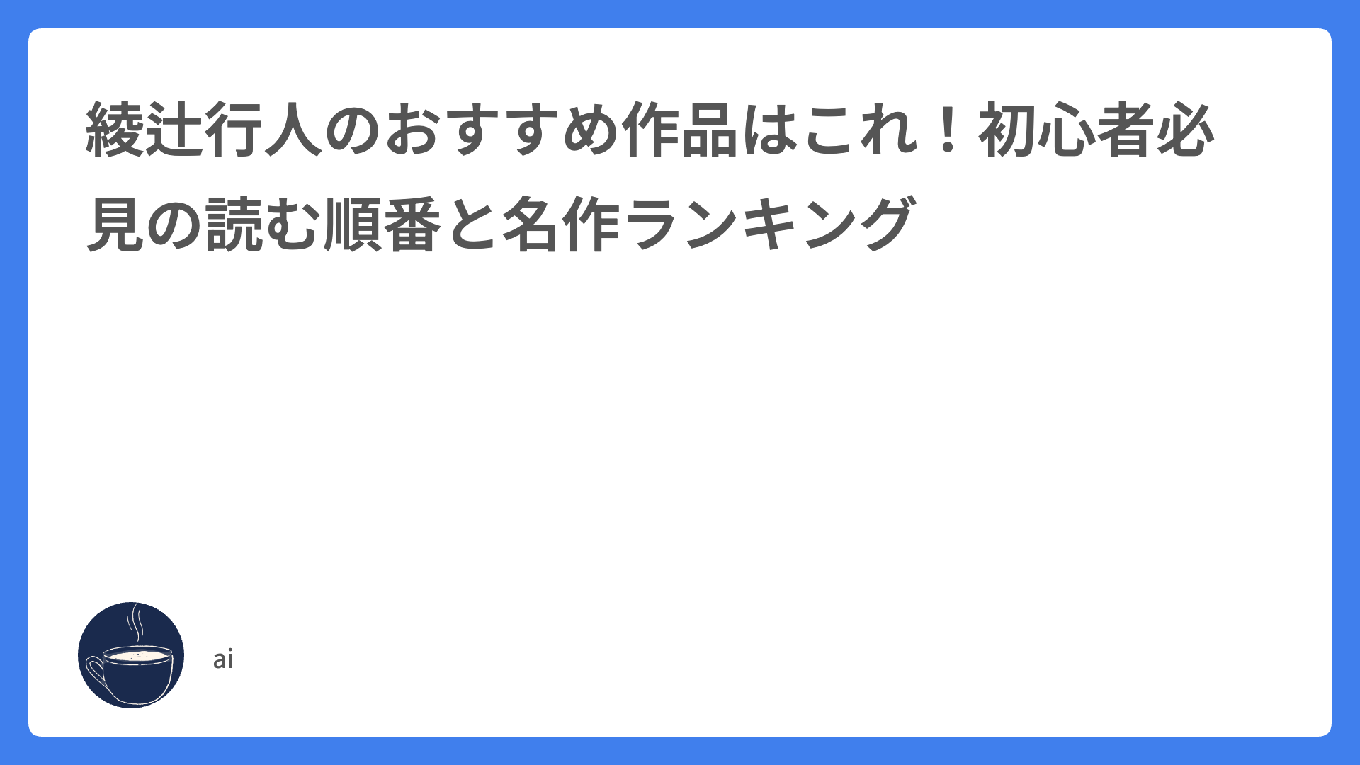 ジャンル別で探す!池井戸潤のおすすめ12選! 2026.04.03 Uncategorized aika19970710@icloud.com aiの好きな本 読書好きが選ぶ乙一のおすすめ本!白と黒の最高傑作まとめ 2026.03.22 Uncategorized aika19970710@icloud.com aiの好きな本 朝井リョウのエッセイおすすめの順番は?ゆとり三部作を徹底解説 2026.03.19 Uncategorized aika19970710@icloud.com aiの好きな本 小川洋子おすすめ5選!静謐さと不穏さが同居する最高傑作 2026.03.11 Uncategorized aika19970710@icloud.com aiの好きな本 【2026最新】有川ひろのおすすめ作品ランキング!全11作を徹底解説 2026.02.06 Uncategorized aika19970710@icloud.com aiの好きな本 雨穴の小説おすすめの読む順番は?変な家と変な絵どっちから入るべき? 2026.02.04 Uncategorized aika19970710@icloud.com aiの好きな本 【2026最新】朝井リョウの小説おすすめ18選!読む順番と衝撃作 2026.02.02 Uncategorized aika19970710@icloud.com aiの好きな本 朝井リョウのエッセイおすすめガイド!読む順番と爆笑必至の三部作 2026.01.31 Uncategorized aika19970710@icloud.com aiの好きな本 綾辻行人のおすすめ作品はこれ!初心者必見の読む順番と名作ランキング 2026.01.30 Uncategorized aika19970710@icloud.com aiの好きな本